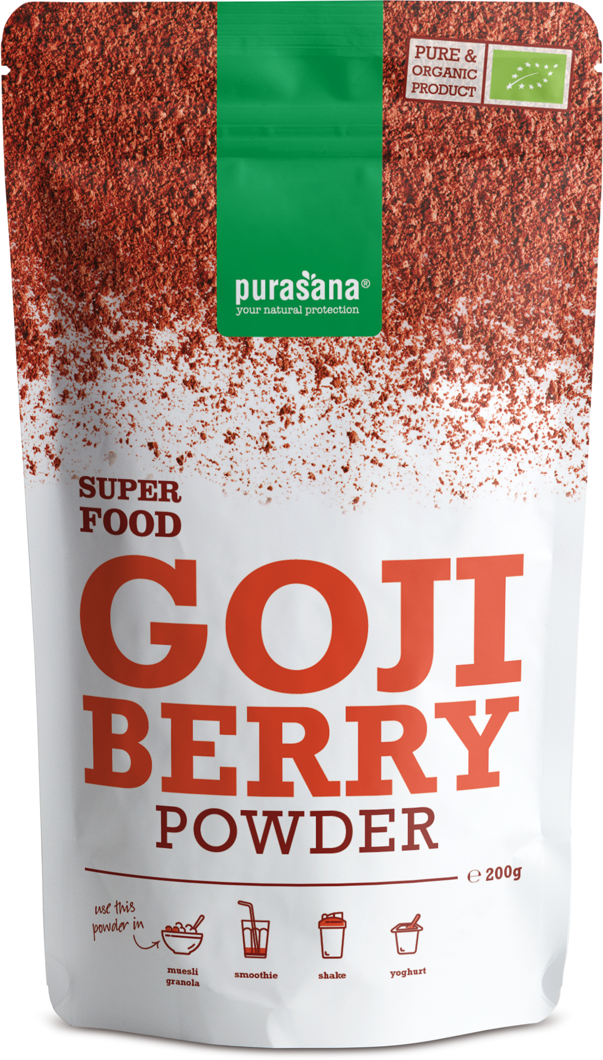 Goji jagode so oranžnordeče, sočne jagode iz Azije, ki rastejo na grmih. Purasan prašek iz goji jagod je liofiliziran prah iz svežih jagod.