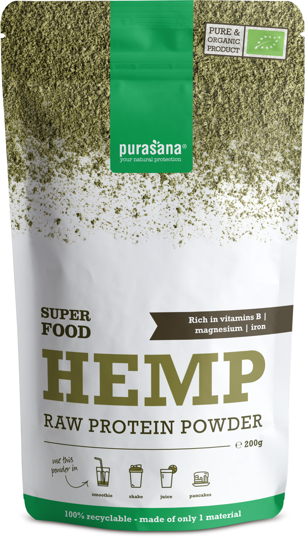 Bio-proteini konoplje v prahu iz skupine Purasana je vir rastlinskih beljakovin. Po naravi bogata z beljakovinami, vlakninami, vitamini in fitokemikalijami.