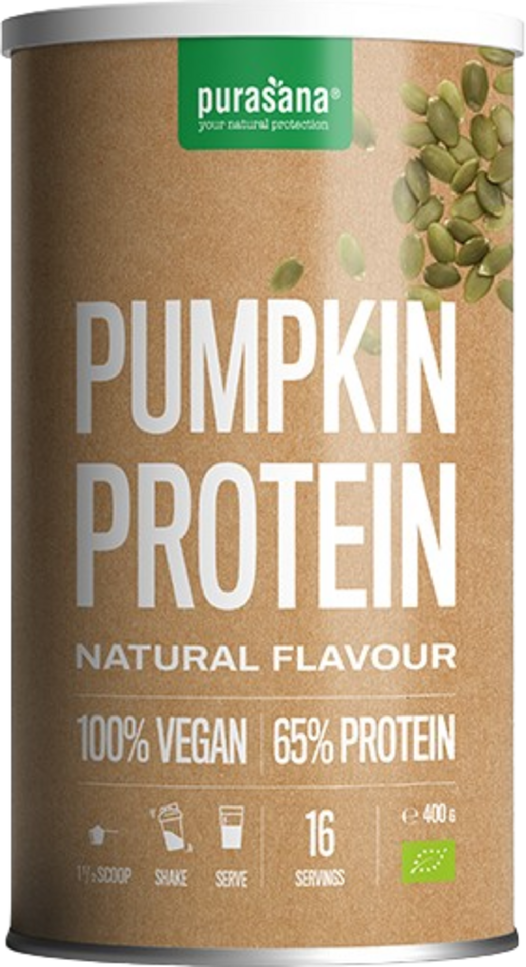 - Purasana Organic Raw bučne beljakovine v prahu so narejene iz surovin in bio-avstrijskih bučnih semen. Okusna proteinska varianta še vedno obsega približno 8% - 10% bučnega olja in približno 65% rastlinskih beljakovin.