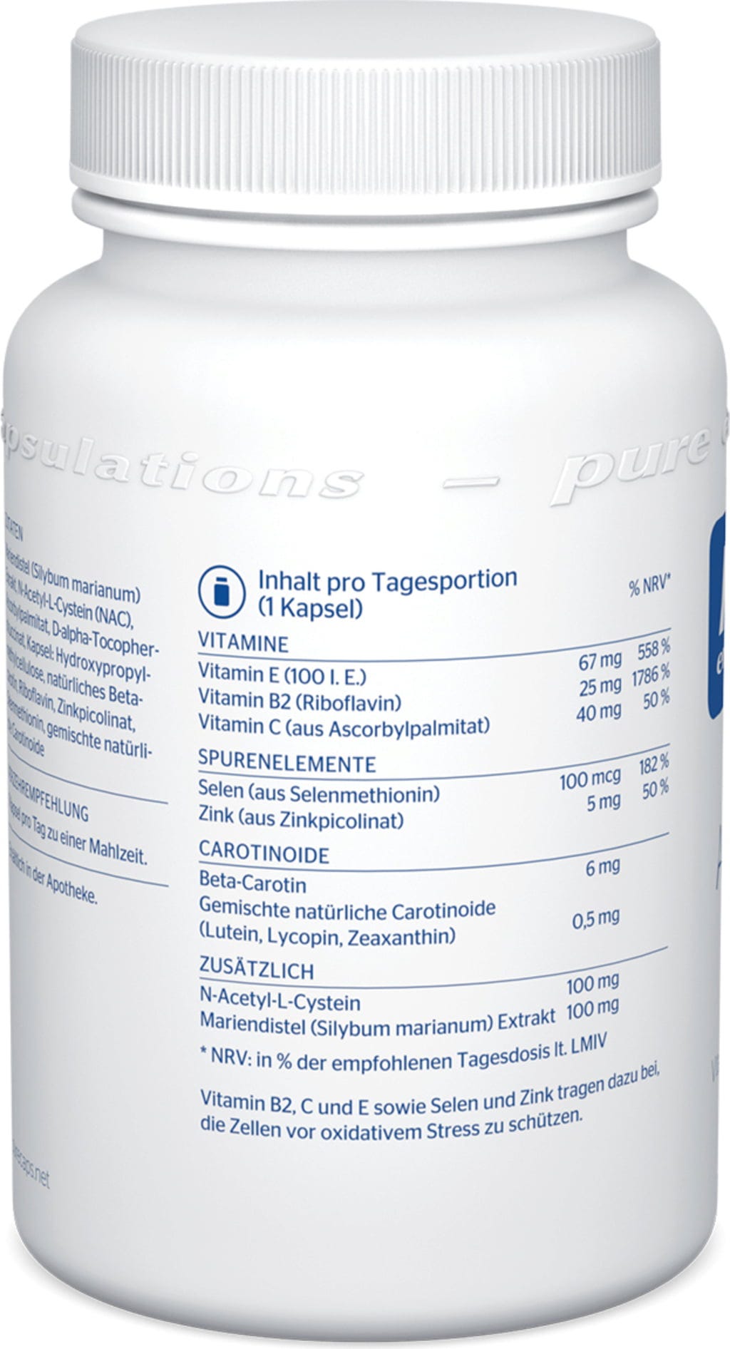 pegasti badelj (Silybum marianum) izvleček, N-acetil-L-cistein (NAC), askorbilpalmitat, D-alfa tokoferolsukcinat (vitamin E), hidroksietilmetilceluloza[1], Naravni beta karotin, riboflavin (vitamin B2), cinkovpikolinat, selenmetionin, mešanica naravnih kartinoidov
