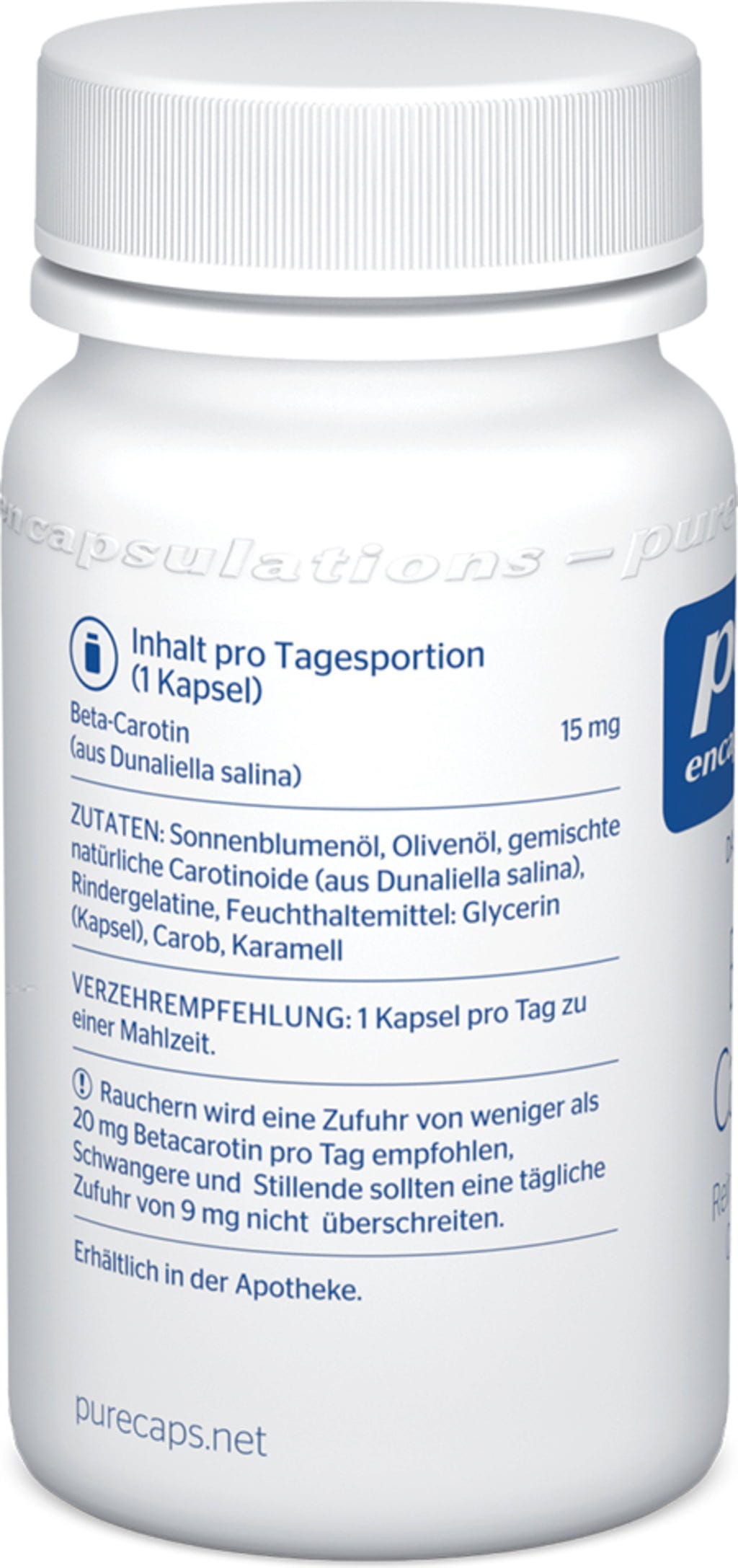 - Pure Encapsulations® Beta Carotene, popolnoma rastlinski karotenoidni kompleks iz alg Dunaliella in vsebuje naravni beta-karoten.