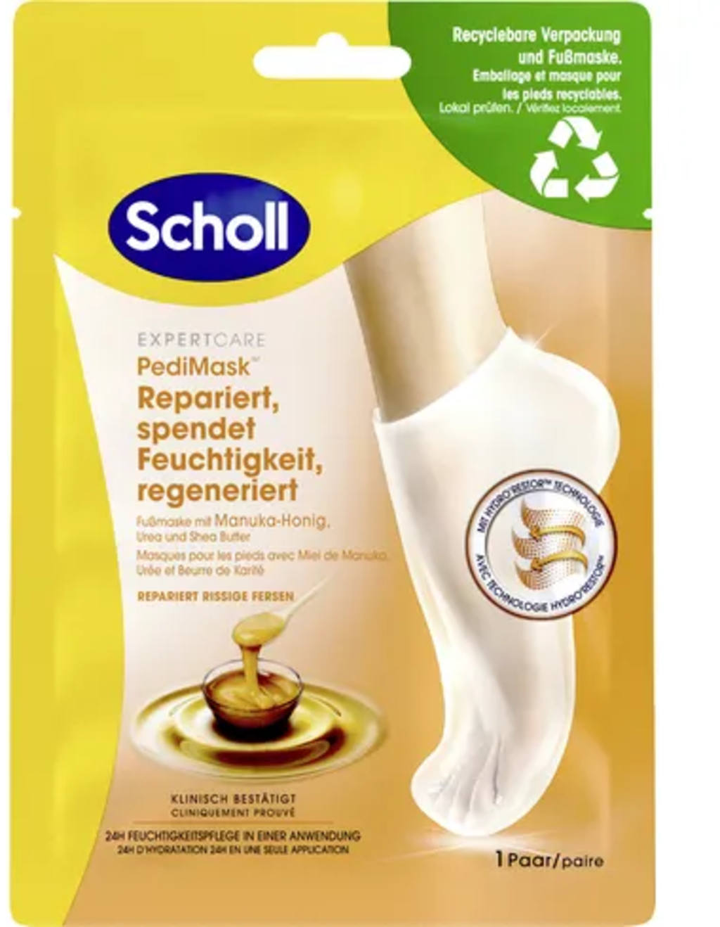 Z ExpertCare masko za stopala z manuka medom znamke Scholl bodo vaša stopala v hipu spet mehka. Manuka med in karitejevo maslo kožo intenzivno negujeta in zagotavljata dragoceno, dolgotrajno hidracijo.