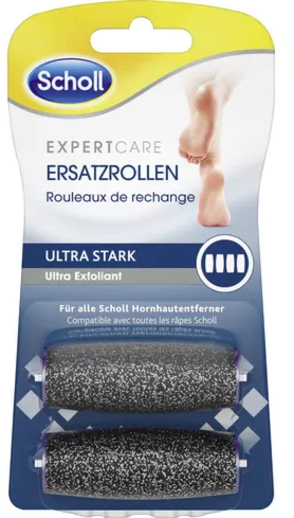 Nadomestna valjčka za ExpertCare električni odstranjevalec trde kože Ultra Exfaliant lahko uporabljate z vsemi električnimi odstranjevalci trde kože znamke Scholl. Valjčki z diamantnimi kristali zagotavljajo nežno, a učinkovito odstranjevanje trde kože. Uporabljate jih lahko na suhi in mokri koži.