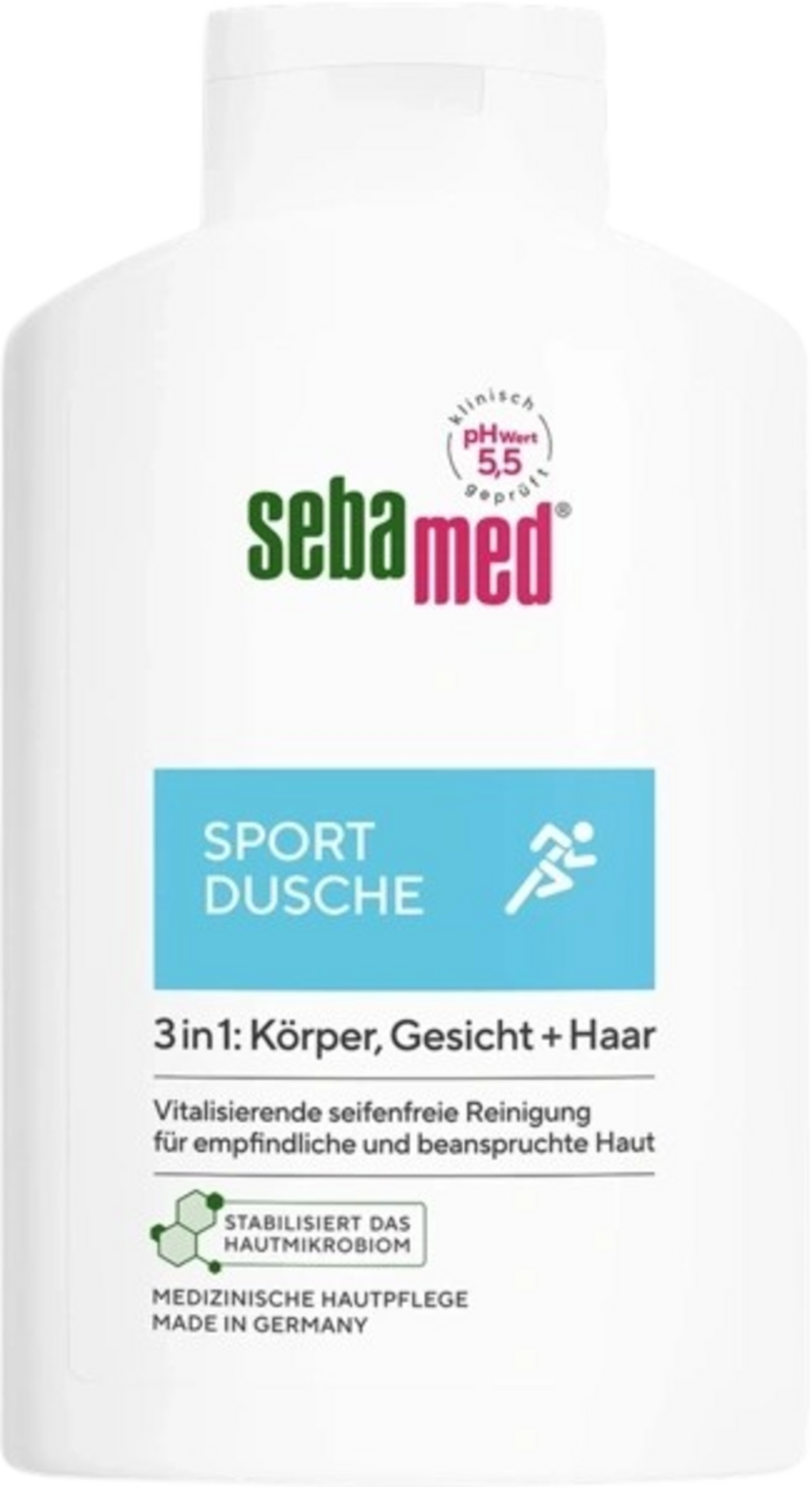 Sport gel za prhanje 3 v 1 brez mikroplastike znamke sebamed zanesljivo in nežno očisti vašo občutljivo in obremenjeno kožo telesa in obraza ter lase po vsaki športni vadbi. Vaša koža je takoj osvežena in poživljena. Formula ima koži lastno pH vrednost 5,5 in tako celo podpira naravni zaščitni sloj vaše kože.