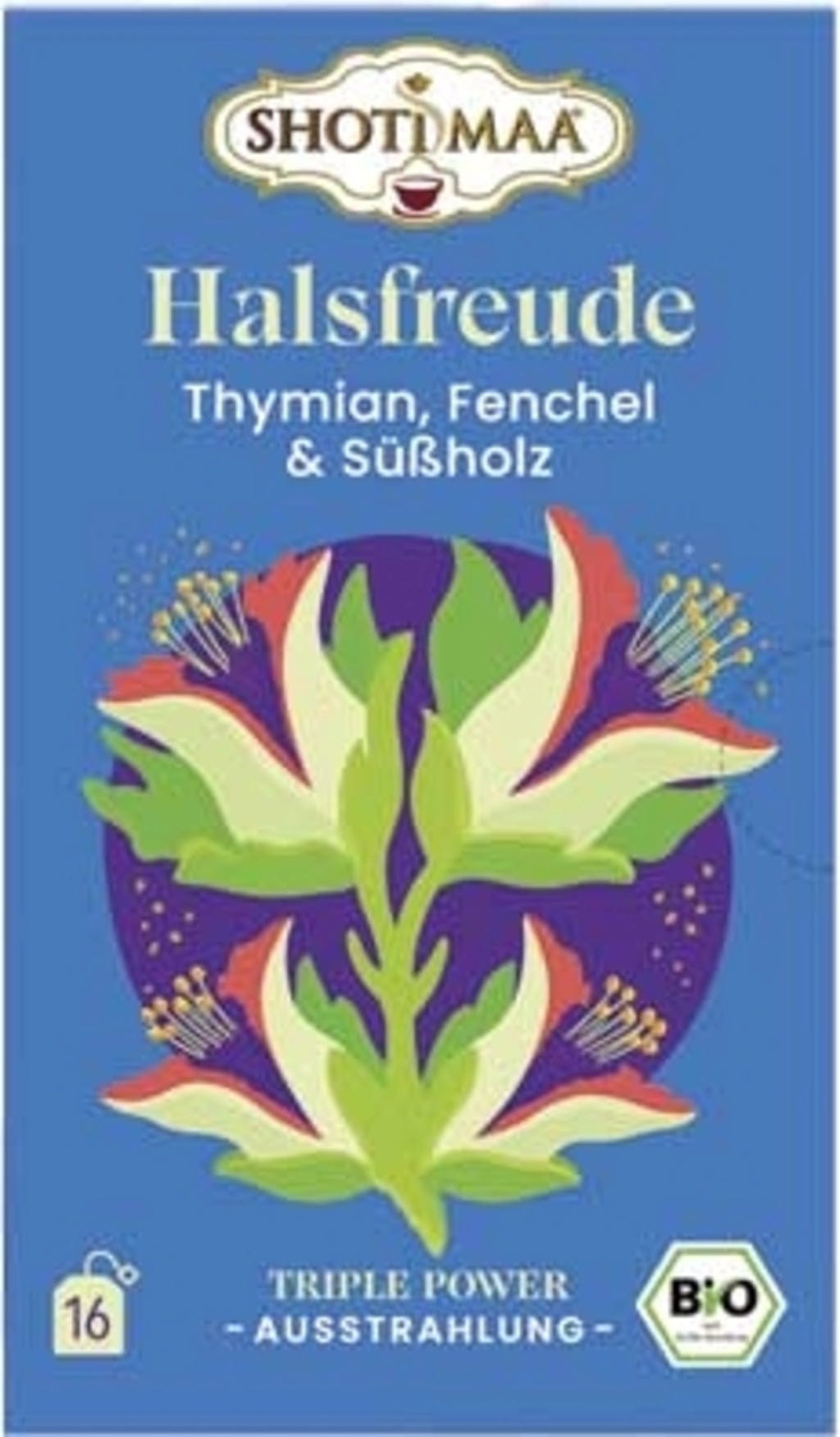 Shoti Maa Bio čaj za "Zadovoljno grlo" - timijan, komarček in sladki koren, 16 čajnih vrečk (32 g)