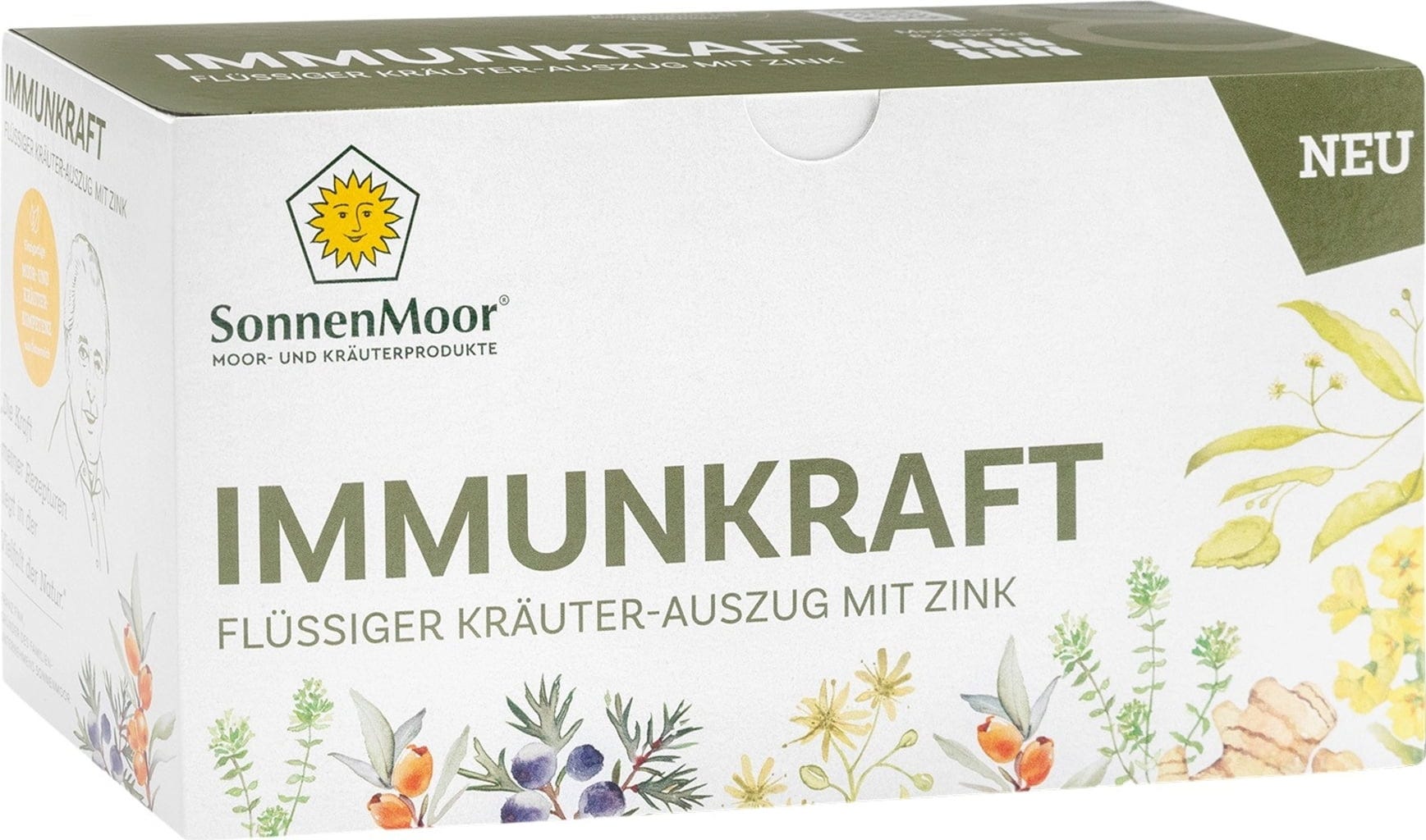 Immunkraft znamke SonnenMoor je izključno zeliščni izdelek, ki združuje dvanajst skrbno izbranih zelišč, jagod in korenin v tekoči obliki. Formula temelji na tradicionalno cenjenih rastlinah, kot so lipovi cvetovi, timijan, šipek in bezeg. Mešanico dopolnjujejo dragocene korenine ingverja in kurkume ter mineral cink.