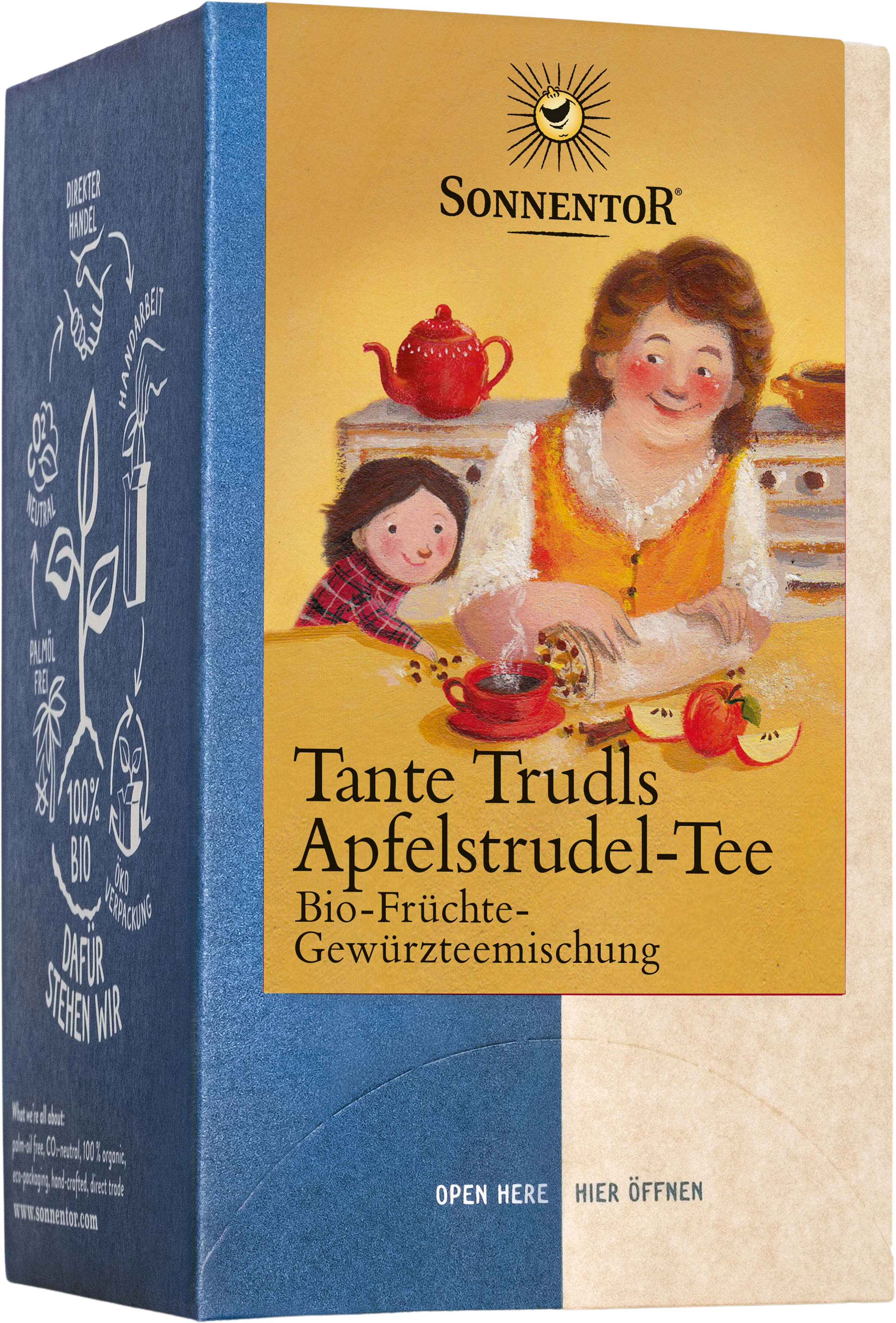 Že ob vstopu v hišo tete Trudi zadiši po slastni aromi jabolk in cimeta, zato vsakdo ve, da peče njen najboljši jabolčni zavitek. Sedaj lahko vsak dan uživate v okusni mešanici sladkega jabolčnega zavitka s cimetom v obliki toplega čaja.
