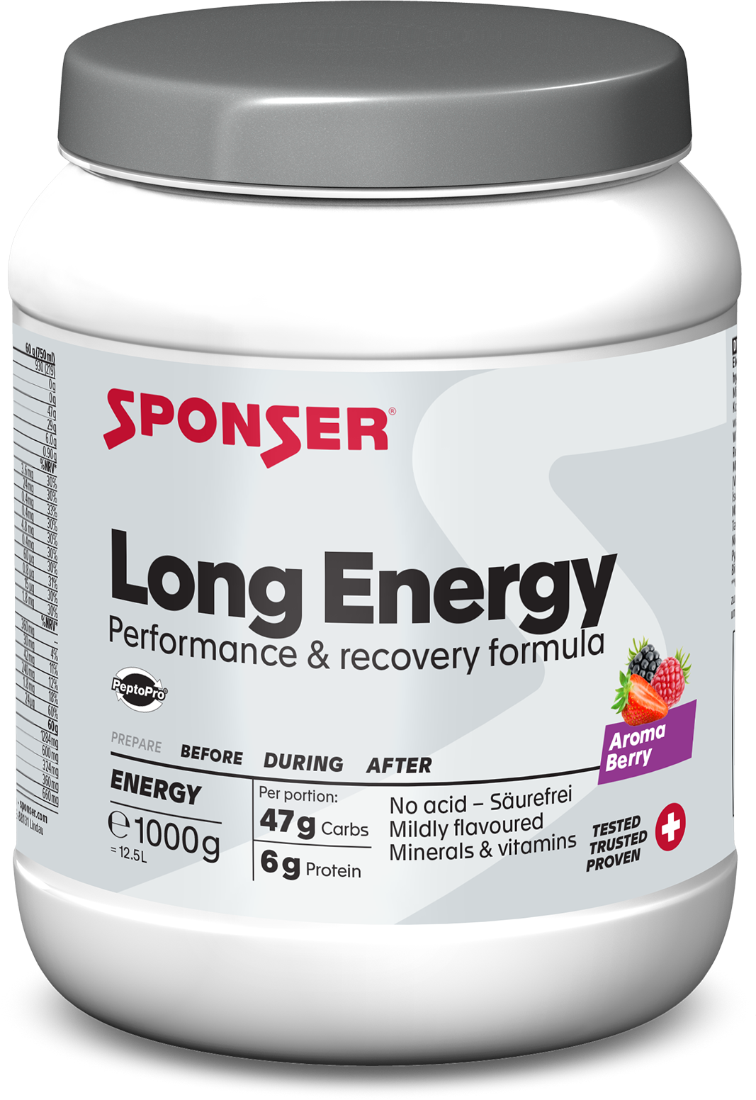 Za dolg in intenziven napor potrebujete dobro načrtovan vnos energije. Long Energy znamke Sponser® Sport Food združuje koncept več ogljikovih hidratov s proteinskimi hidrolizati in esencialnimi elektroliti. Posebna Multi Carb formula vam zaradi ogljikovih hidratov z različnimi glikemičnimi indeksi zagotavlja učinkovit in dolgotrajen vir energije. Zahvaljujoč sestavini Vitargo (voskasti koruzni škrob) je dosežena nizka osmolarnost, ki zagotavlja enakomerno topnost v napitku.