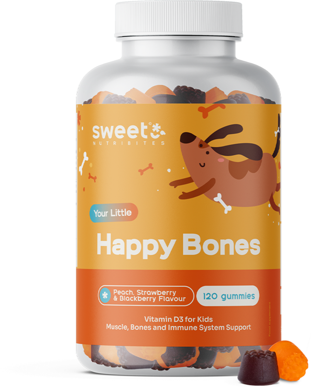 Gumijasti bonboni Happy Bones znamke Sweet Nutribites so pametna rešitev za vse starše, ki iščejo preprosto alternativo tradicionalnim kapsulam ali tabletam. Na voljo so v treh priljubljenih okusih – breskev, jagoda in robida – ti mehki gumijasti bonboni pa bodo prepričali tudi najbolj izbirčne jedce.