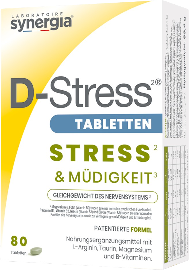 D-Stress²® znamke Synergia vam ponuja natančno usklajeno sestavo za vaše vsakdanje življenje ali športno vadbo. Vsak dnevni odmerek vsebuje aminokislini L-arginin in taurin ter vrsto esencialnih vitaminov skupine B, vključno z vitamini B1, B2, B3, B5, B6, biotinom in folno kislino. Formula je dopolnjena z magnezijem v obliki magnezijevega glicerofosfata in magnezijevega citrata.