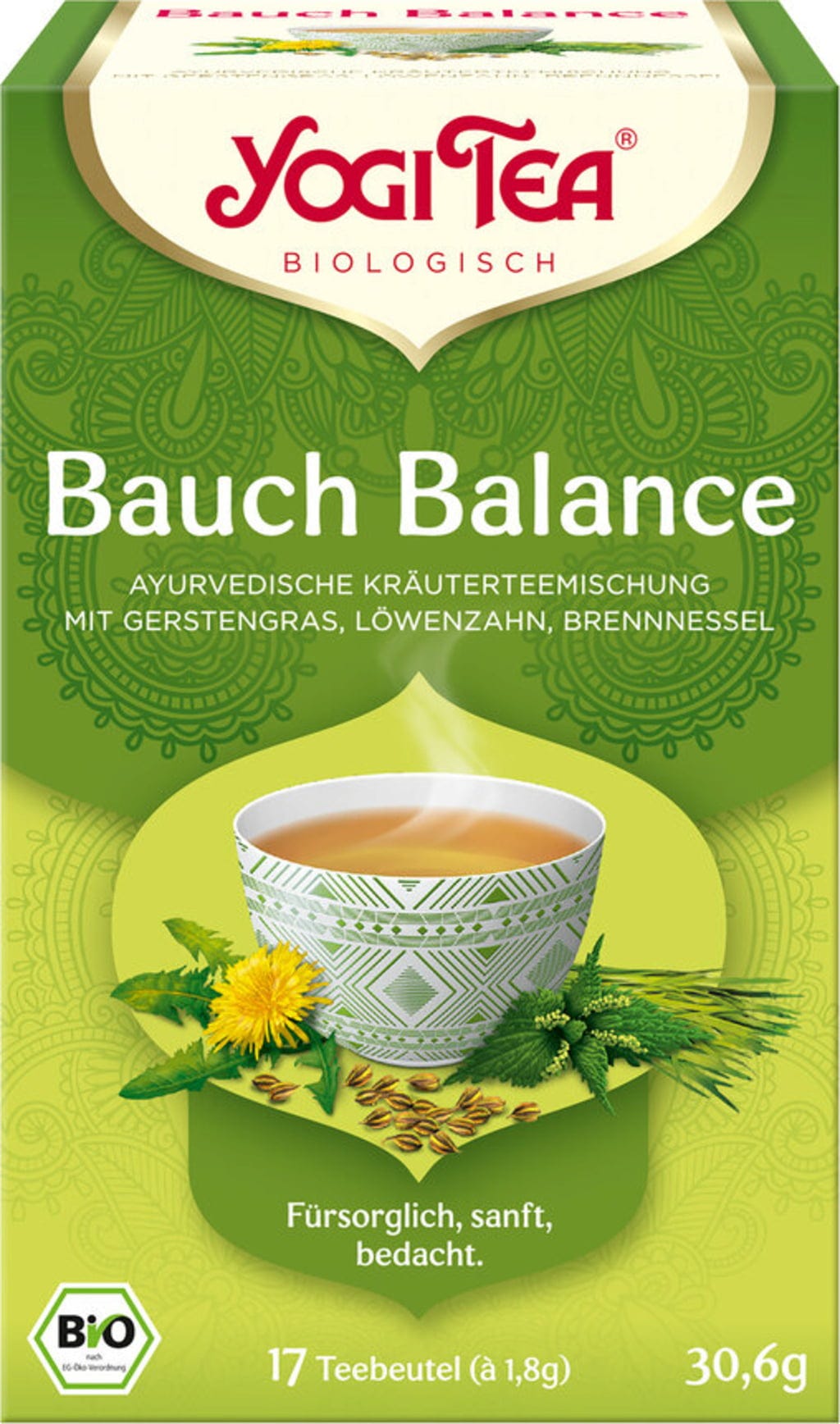 Skrbna, nežna, skrbna - tako se predstavlja ta ajurvedska mešanica zeliščnega čaja. Je kot nalašč za vse, ki si želijo več lahkotnosti v vsakdanjem življenju. Blag okus ječmenove trave, regrata in koprive je nežen tudi za brbončice.